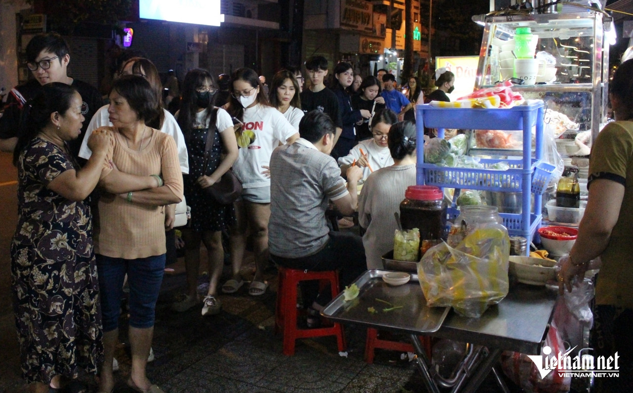 Nửa đêm, đoạn vỉa hè trên đường Trần Bình Trọng (phường Chợ Quán, TPHCM) chật kín người và xe. Ngoài những thực khách đang ngồi kín các bàn ăn đặt trên đoạn vỉa hè, còn có dòng người đứng xếp thành hàng dài phía trước chiếc tủ kính đựng đầy thức ăn.