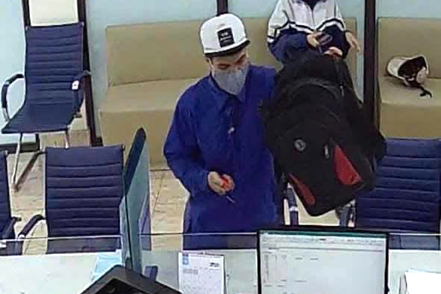 Một nam thanh niên mặc quần áo sẫm màu, đội mũ lưỡi trai trắng, đeo khẩu trang, mang theo balo và cầm vật giống dao đã xông vào ngân hàng.