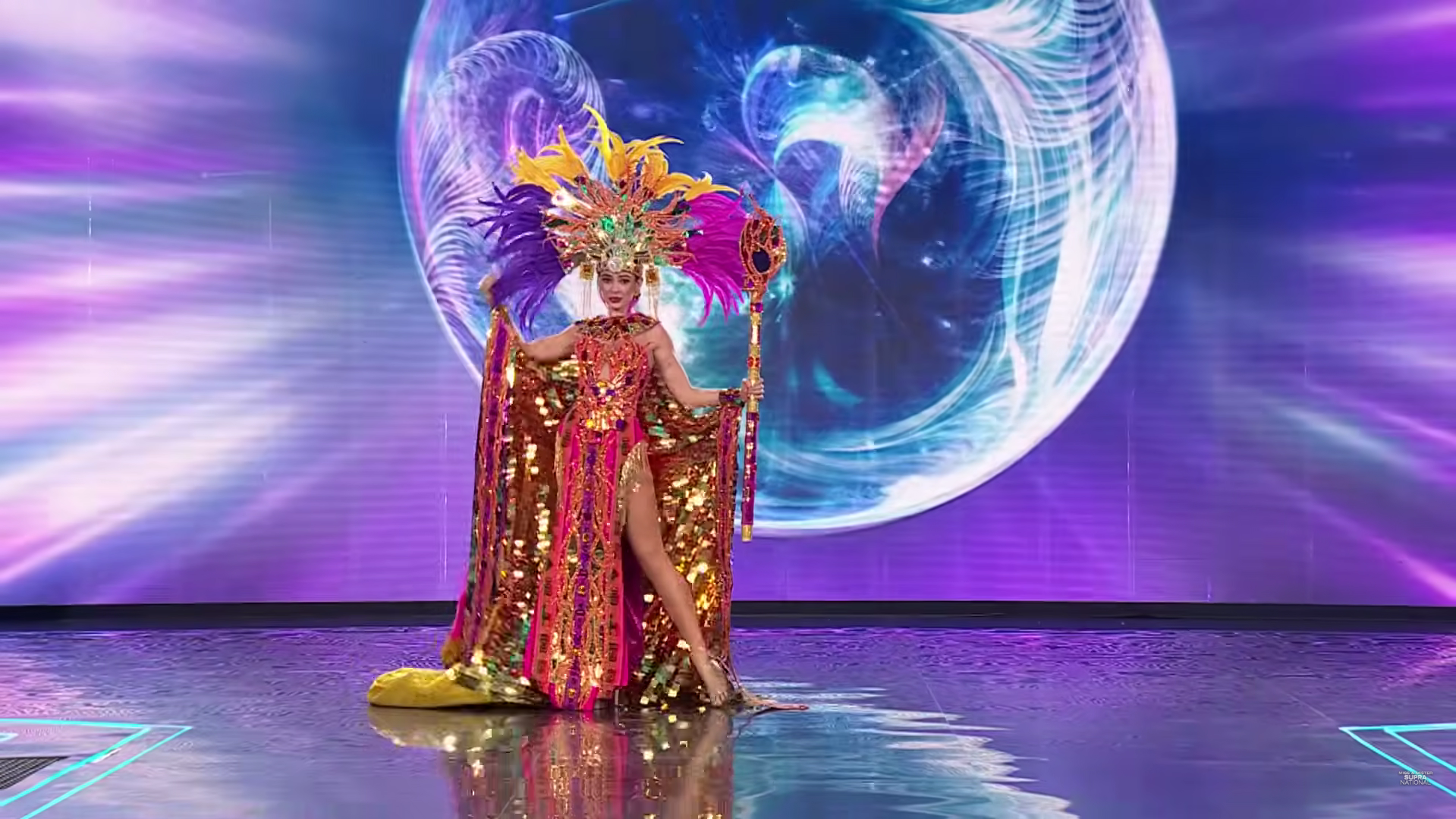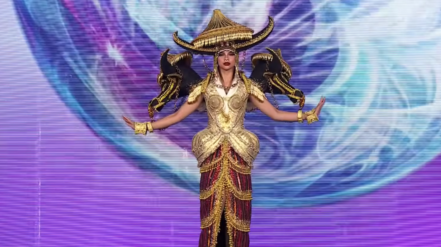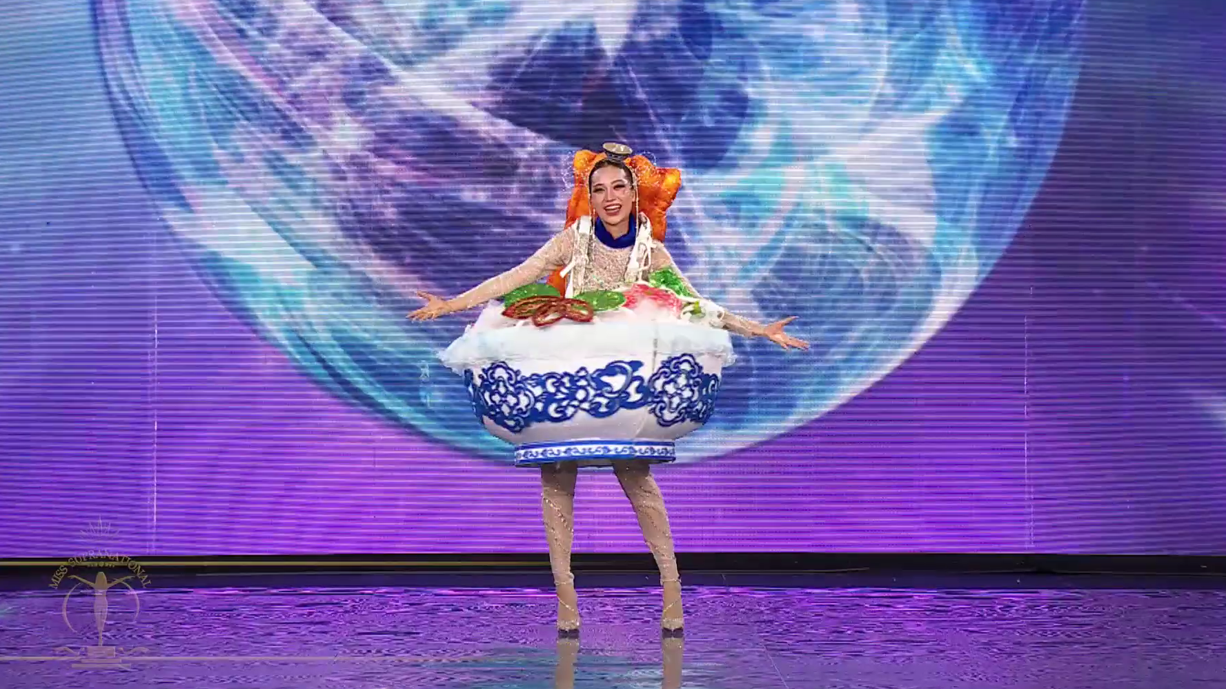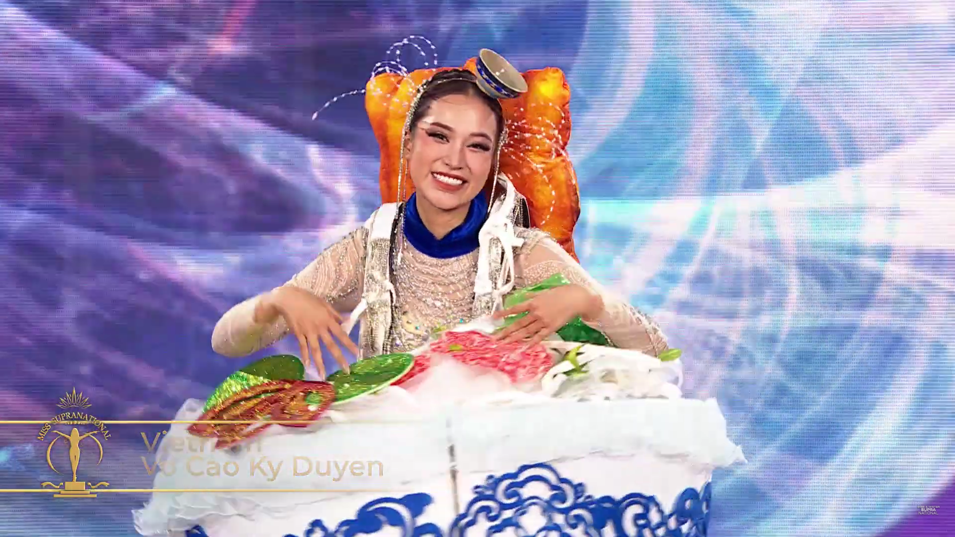 Đại diện Việt Nam - Võ Cao Kỳ Duyên gây ấn tượng khi hóa thân thành một tô phở Hà Nội ăn kèm quẩy. Thiết kế mô phỏng chiếc tô sứ hoa lam quen thuộc đi kèm các chi tiết như thịt bò, rau thơm, quẩy và chén nước chấm đặt trên đầu. Dù bộ trang phục khá cồng kềnh, Kỳ Duyên vẫn tự tin sải bước, nở nụ cười rạng rỡ với đạo cụ.